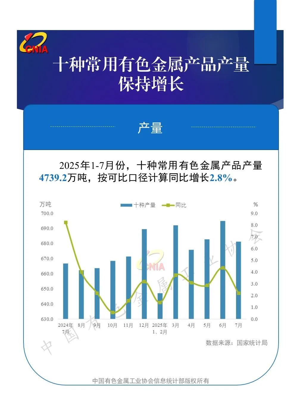 分產(chǎn)品看,7月份,十種有色金屬產(chǎn)量681.3萬噸,同比增長2.2%,其中,原鋁(電解鋁)377.9萬噸,增長0.6%。1—7月份,十種有色金屬產(chǎn)量4739.2萬噸,同比增長2.8%,增幅比上半年收窄0.1個百分點,其中,原鋁(電解鋁)2637.7萬噸,增長2.8%,其對十種有色金屬增長的貢獻率為55.8%。
