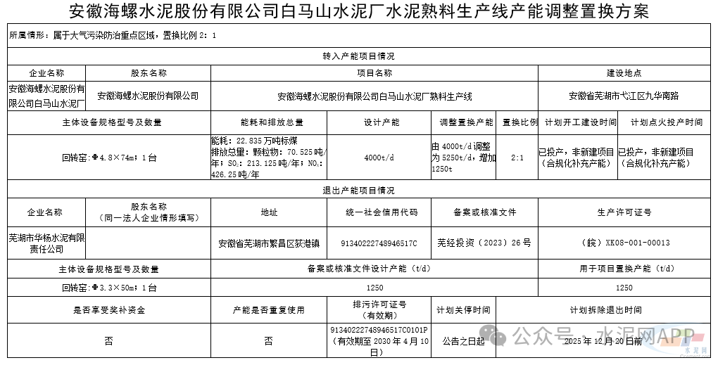 8月29日,安徽省蕪湖市工信局發(fā)布關(guān)于安徽海螺水泥股份有限公司白馬山水泥廠水泥熟料生產(chǎn)線產(chǎn)能置換方案的公示。