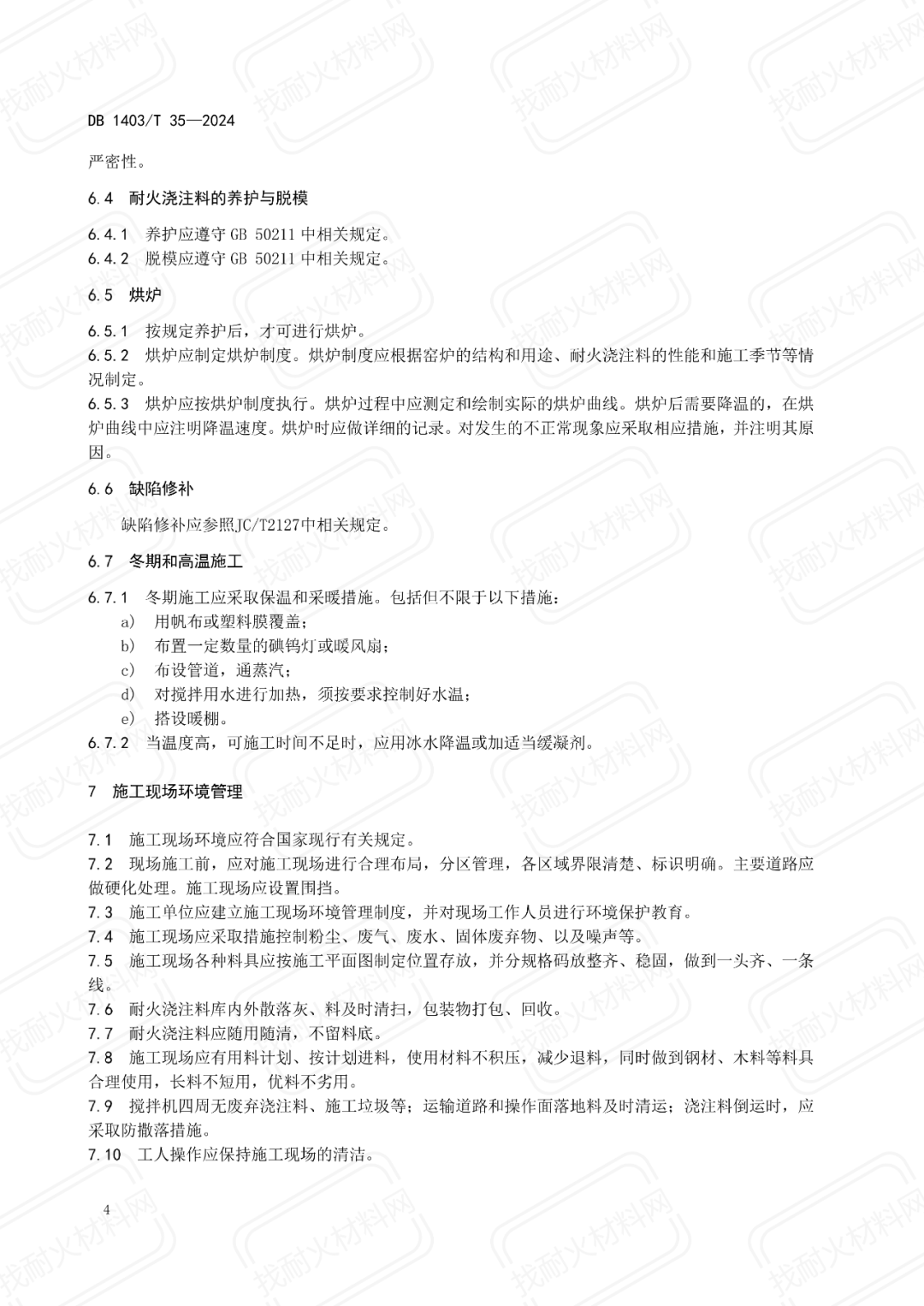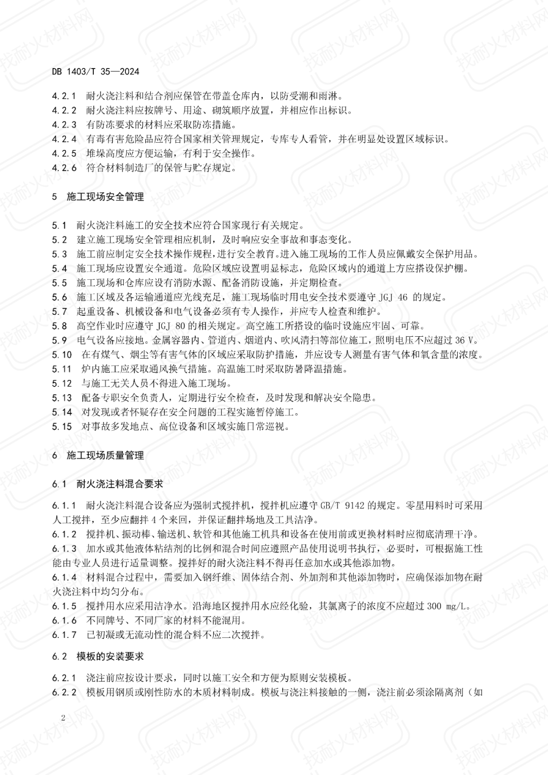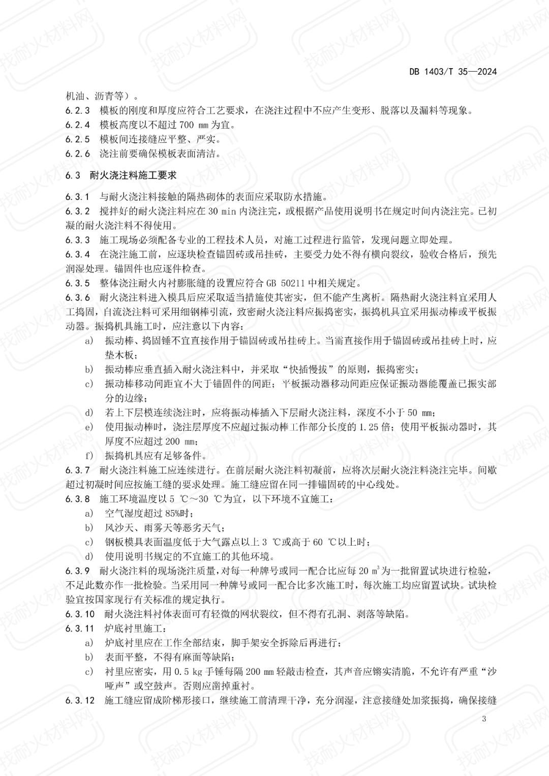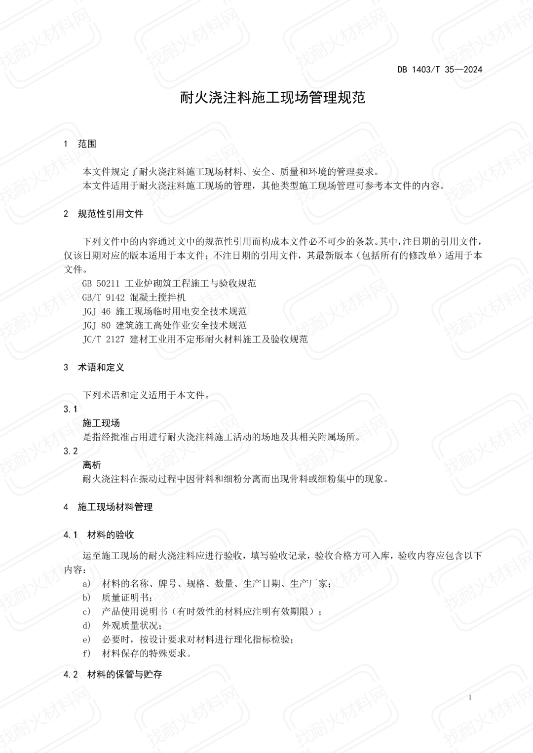【地方標(biāo)準(zhǔn)】DB1403/T 35-2024耐火澆注料施工現(xiàn)場管理規(guī)范