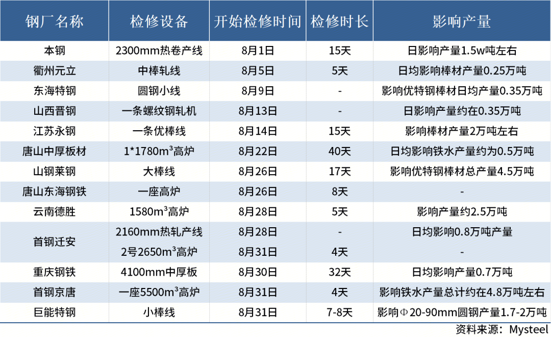 據(jù)Mysteel不完全統(tǒng)計(jì),8月以來國內(nèi)13家鋼廠發(fā)布檢修信息,其中,首鋼京唐計(jì)劃于8月31日對一座5500m3高爐進(jìn)行檢修至9月3日結(jié)束,為期4天左右,影響鐵水產(chǎn)量總計(jì)約在4.8萬噸左右。具體情況如下: