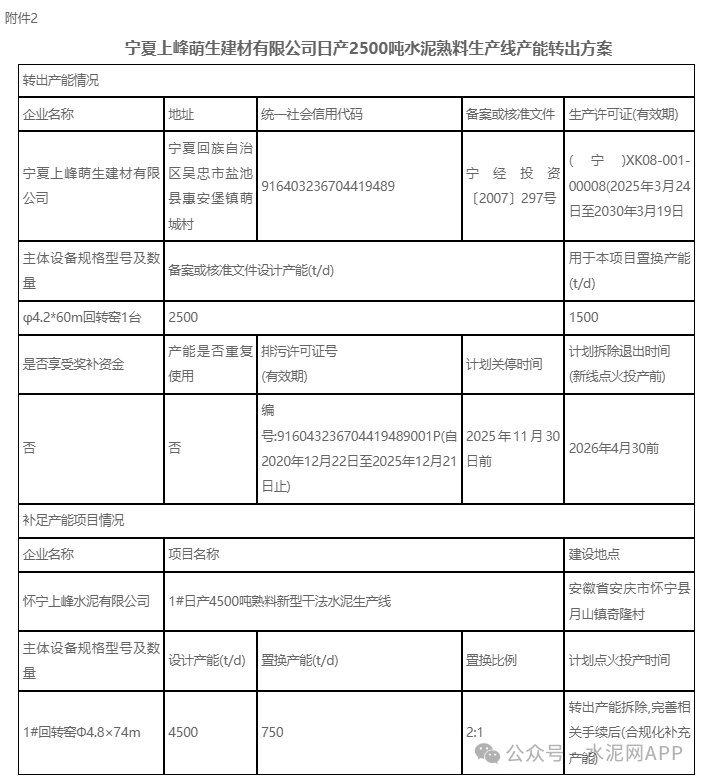 9月3日,寧夏工業(yè)廳發(fā)布“關(guān)于寧夏上峰萌生建材有限公司水泥熟料生產(chǎn)線補足產(chǎn)能置換和產(chǎn)能轉(zhuǎn)出方案的公示”。