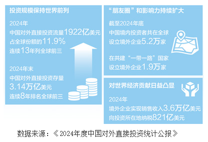 中國是吸引外資的大國,也是對外投資大國。2024年中國對外直接投資流量為1922億美元,連續(xù)13年列全球前三。隨著產(chǎn)業(yè)結(jié)構(gòu)升級,高新技術(shù)產(chǎn)品、高端裝備、綠色低碳產(chǎn)品成為中國制造“出海”新增長點(diǎn)。中國企業(yè)“出?!背掷m(xù)向新向綠,“中國投資”展現(xiàn)出強(qiáng)大的韌性和活力。