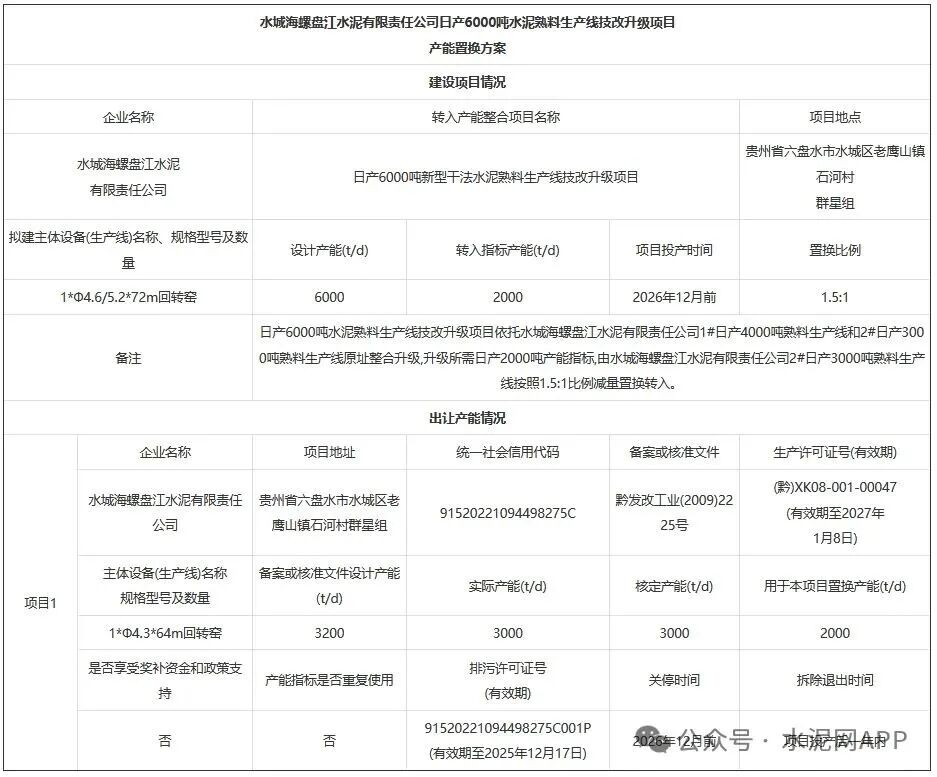 另?yè)?jù)此前貴州工信廳發(fā)布,水城海螺盤江水泥6000t/d技改升級(jí)項(xiàng)目產(chǎn)能置換方案如下: