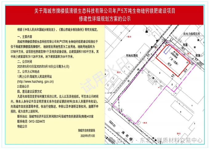 為切實(shí)增強(qiáng)規(guī)劃的科學(xué)性、合理性和可行性,征求公眾意見,根據(jù)《中華人民共和國城鄉(xiāng)規(guī)劃法》第二十六條規(guī)定,現(xiàn)將海城市牌樓鎮(zhèn)清鎂生態(tài)科技有限公司年產(chǎn)5萬噸生物硅鈣鎂肥建設(shè)項(xiàng)目修建性詳細(xì)規(guī)劃方案內(nèi)容公告如下: