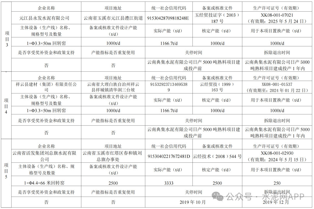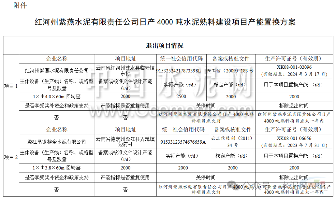 9月11日,云南省工信廳發(fā)布第18號、第19號公告。因故未實施,紅河州紫燕水泥有限責任公司申請撤銷“紅河州紫燕水泥有限責任公司日產(chǎn)4000噸水泥熟料建設項目產(chǎn)能置換方案”。按照原計劃,該企業(yè)擬建一條4000t/d熟料生產(chǎn)線項目,退出紅河州紫燕水泥有限責任公司2000t/d、盈江昆鋼榕全水泥有限公司2000t/d、峨山宏峰建材有限責任公司2000t/d共計3條生產(chǎn)線。