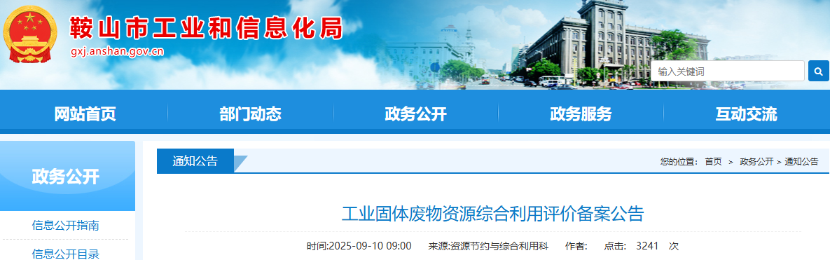 按照工信部《工業(yè)固體廢物資源綜合利用評價(jià)管理暫行辦法》、《國家工業(yè)固體廢物資源綜合利用產(chǎn)品目錄》、省工信廳《遼寧省工業(yè)和信息化廳關(guān)于做好工業(yè)固體廢物資源綜合利用評價(jià)工作的通知》(遼工信資源〔2023〕129號)及《鞍山市工業(yè)固體廢物資源綜合利用評價(jià)管理實(shí)施辦法》要求,2025年9月3日-2025年9月9日,我局對鞍山廈美環(huán)??萍加邢薰?、鞍山昊通新材料有限公司、鞍鋼綠色資源科技有限公司工業(yè)固體廢物綜合利用評價(jià)進(jìn)行備案公示。截至公示期結(jié)束,未收到不同意見,現(xiàn)予以公布。
