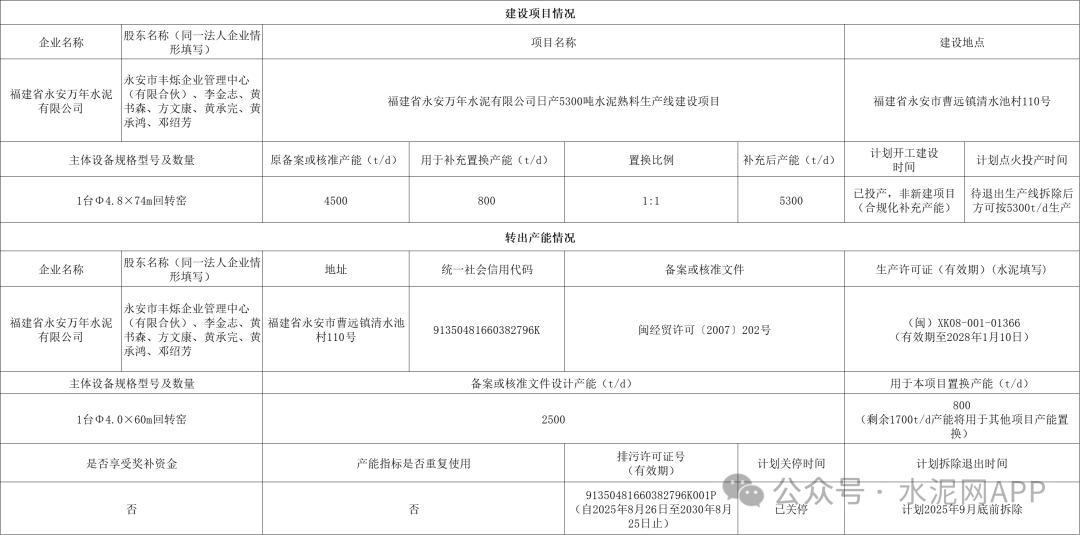 置換方案顯示,福建省永安萬年水泥一條4500t/d熟料線補(bǔ)充產(chǎn)能800t/d,補(bǔ)充后產(chǎn)能為5300t/d,退出產(chǎn)能來自同企業(yè)一條2500t/d熟料線(800t/d用于該項(xiàng)目,剩余1700t/d用于其他項(xiàng)目)。