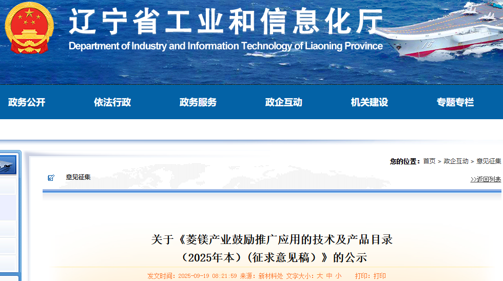 按照《遼寧省人民政府辦公廳關(guān)于推進菱鎂行業(yè)高質(zhì)量發(fā)展的實施意見》(遼政辦發(fā)〔2023〕15號)精神,為持續(xù)搭建技術(shù)交流平臺,推動新技術(shù)、新產(chǎn)品成果轉(zhuǎn)化,持續(xù)提升菱鎂行業(yè)高端化、智能化、綠色化水平。經(jīng)企事業(yè)單位自主申報、市工信局推薦,我廳征集了已進入或接近產(chǎn)業(yè)化應用階段、有推廣應用意向、暫無社會異議的22項新技術(shù)、新產(chǎn)品,經(jīng)相關(guān)專家論證,現(xiàn)將《菱鎂產(chǎn)業(yè)鼓勵推廣應用的技術(shù)及產(chǎn)品目錄(2025年本)(征求意見稿)》予以公示,公示期為5個工作日。