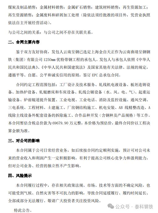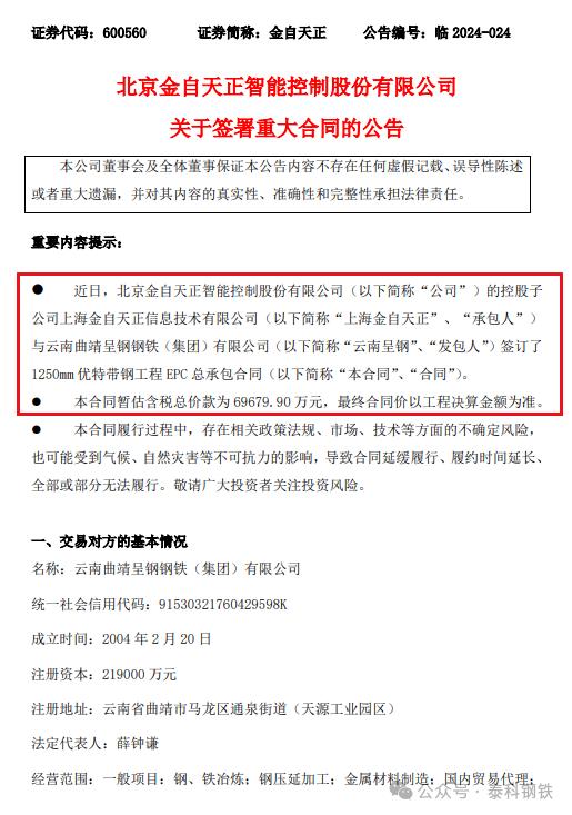 金自天正7月17日公告稱,其控股子公司上海金自天正信息技術(shù)有限公司與云南曲靖呈鋼鋼鐵(集團(tuán))有限公司簽訂了1250mm優(yōu)特帶鋼工程EPC總承包合同。本合同暫估含稅總價款為69679.90萬元,最終合同價以工程決算金額為準(zhǔn)。合同履行過程中,存在相關(guān)政策法規(guī)、市場、技術(shù)等方面的不確定風(fēng)險,也可能受到氣候、自然災(zāi)害等不可抗力的影響。合同約定工程范圍包括:工廠設(shè)計及技術(shù)服務(wù)、軋線機(jī)電液設(shè)備、板坯連鑄設(shè)備、加熱爐設(shè)備等工作。本次合同簽訂屬于公司日常經(jīng)營業(yè)務(wù),預(yù)計可對公司未來的營業(yè)收入和利潤產(chǎn)生一定積極影響。