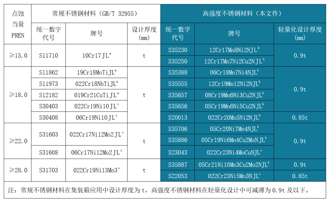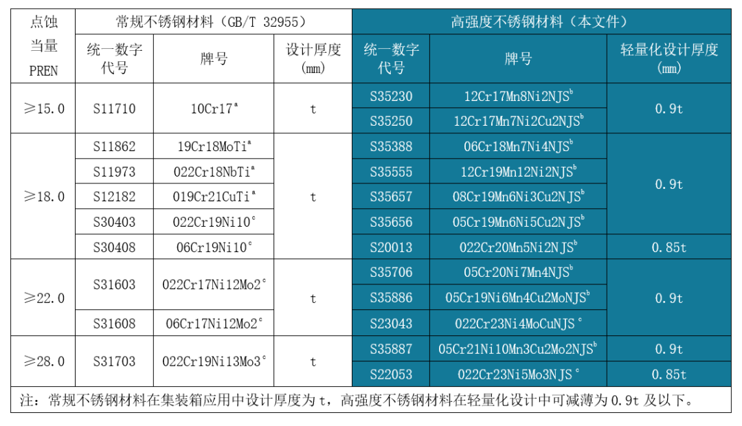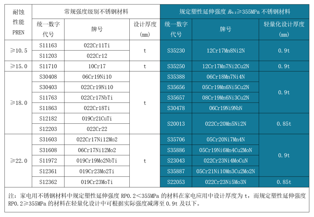 經(jīng)濟型高強度不銹鋼,包括QN系列奧氏體不銹鋼及QD2001雙相不銹鋼在保持良好耐蝕性、焊接性和冷加工性的基礎(chǔ)上顯著提升了強度,可助推集裝箱及家電等領(lǐng)域的產(chǎn)品輕量化設(shè)計。新發(fā)布的行業(yè)標準中推薦,高強度不銹鋼相對常規(guī)產(chǎn)品可減薄10%-15%(詳見表1~表3),這對于產(chǎn)業(yè)鏈節(jié)能減排和可持續(xù)綠色發(fā)展具有重要意義。