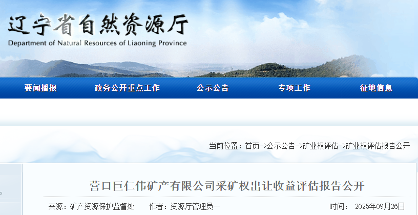 按照《關(guān)于完善礦業(yè)權(quán)出讓收益評估程序的通知》(遼自然資辦發(fā)[2022]2號)要求,《營口巨仁偉礦產(chǎn)有限公司采礦權(quán)出讓收益評估報告》及相關(guān)附件已在省自然資源廳公示10個工作日,無異議,予以公開。