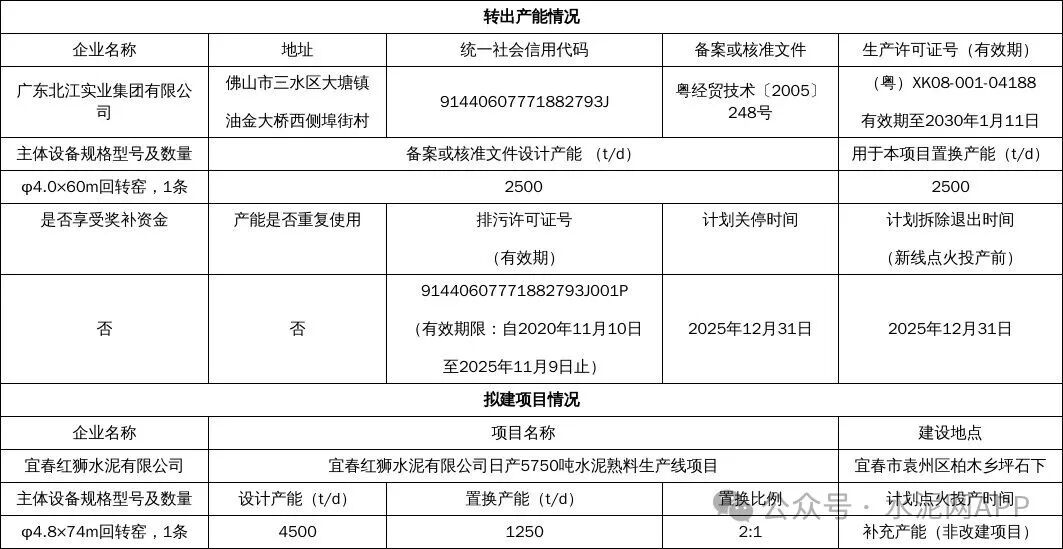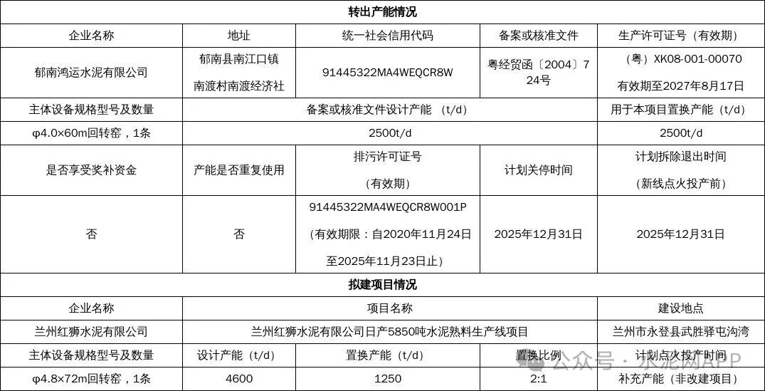 置換方案顯示,廣東北江實業(yè)集團轉出一條2500t/d熟料生產線,用于補充宜春紅獅水泥一條4500t/d熟料線,補充后產能為5750t/d。郁南鴻運水泥轉出一條2500t/d熟料生產線,用于補充蘭州紅獅水泥一條4600t/d熟料線,補充后產能為5850t/d。