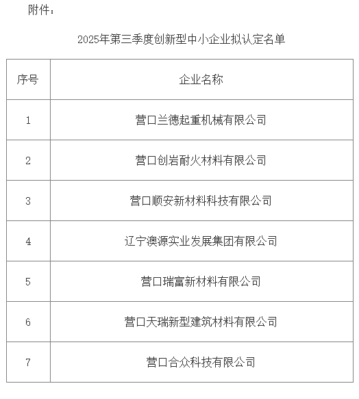 按省工信廳《關(guān)于做好2025年度創(chuàng)新型中小企業(yè)申報工作的通知》要求,經(jīng)企業(yè)登錄優(yōu)質(zhì)中小企業(yè)梯度培育平臺自愿申報,各縣(市)區(qū)、園區(qū)工信主管部門推薦,營口市工信局初審,擬認定營口創(chuàng)巖耐火材料有限公司等7家企業(yè)為2025年第三季度創(chuàng)新型中小企業(yè),現(xiàn)將通過名單予以公示。任何單位或個人對公示有異議的,可在公示期內(nèi)與市工信局聯(lián)系。