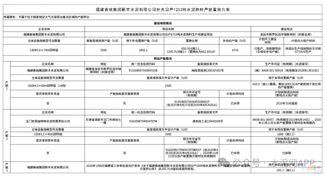 變更后為福建春馳新豐水泥一條5500t/d熟料生產(chǎn)線補充產(chǎn)能1856.2t/d,補充后產(chǎn)能為6753t/d,退出產(chǎn)能來自該企業(yè)一條2500t/d及玉門老君廟特種水泥一條1000t/d熟料生產(chǎn)線。