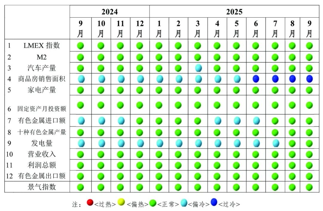 在構(gòu)成有色金屬產(chǎn)業(yè)景氣指數(shù)的12項(xiàng)指標(biāo)中,LMEX指數(shù)、M2、汽車產(chǎn)量、家電產(chǎn)量、有色金屬固定資產(chǎn)月投資額、有色金屬進(jìn)口額、十種有色金屬產(chǎn)量、發(fā)電量、營業(yè)收入、利潤總額及有色金屬出口額等11項(xiàng)指標(biāo)位于“正?!眳^(qū)間,僅商品房銷售面積1項(xiàng)指標(biāo)位于“過冷”區(qū)間。