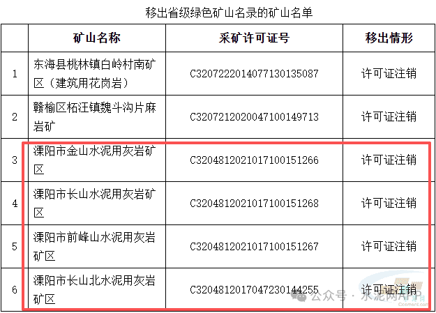 分別為溧陽(yáng)市金山水泥用灰?guī)r礦區(qū)、溧陽(yáng)市長(zhǎng)山水泥用灰?guī)r礦區(qū)、溧陽(yáng)市前峰山水泥用灰?guī)r礦區(qū)、溧陽(yáng)市長(zhǎng)山北水泥用灰?guī)r礦區(qū)。移出情形均為許可證注銷。