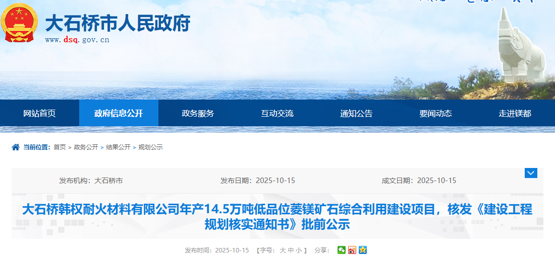 大石橋韓權(quán)耐火材料有限公司年產(chǎn)14.5萬噸低品位菱鎂礦石綜合利用建設(shè)項目,核發(fā)《建設(shè)工程規(guī)劃核實通知書》批前公示