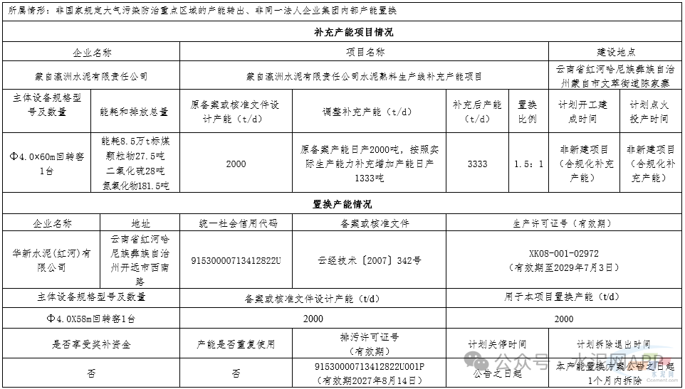 置換方案顯示,蒙自瀛洲水泥原生產(chǎn)線產(chǎn)能2000t/d,補(bǔ)充產(chǎn)能1333t/d,補(bǔ)充后產(chǎn)能為3333t/d,置換產(chǎn)能來自華新水泥(紅河)一條2000t/d熟料生產(chǎn)線,置換比例1.5:1。