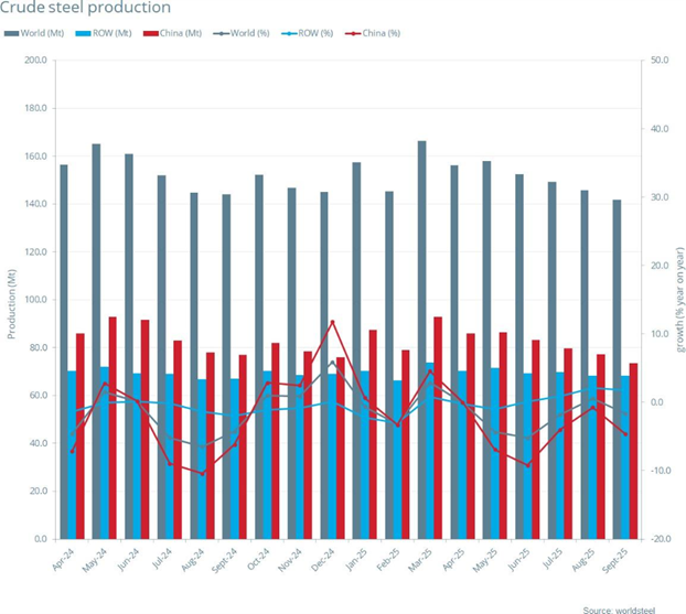 2025年9月全球70個納入世界鋼鐵協(xié)會統(tǒng)計國家/地區(qū)的粗鋼產(chǎn)量為1.418億噸,同比下降1.6%。
