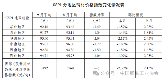 分地區(qū)來看,2025年9月份,CSPI全國六大地區(qū)鋼材價(jià)格指數(shù)平均值環(huán)比均下降。其中,降幅較大的為華東地區(qū),為2.12%,降幅較小的為西北地區(qū),為1.09%。