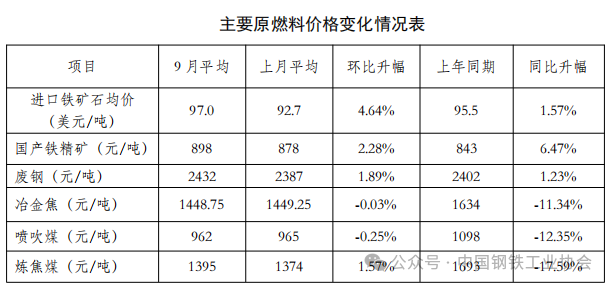 從原燃料來看,與8月相比,主要原燃料各品種平均價(jià)格以上升為主。其中,進(jìn)口鐵礦石漲幅較大,為4.64%,煉焦煤漲幅較小,為1.57%,冶金焦、噴吹煤均價(jià)較為平穩(wěn)。(見下表)