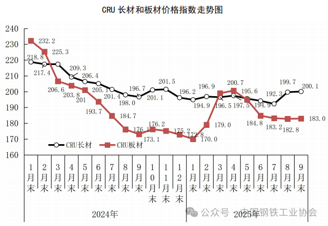 2025年1—9月,CRU國際鋼材價(jià)格指數(shù)平均值為189.7 點(diǎn),同比下降12.6點(diǎn),降幅為6.2 %。其中,CRU長(zhǎng)材指數(shù)平均值為196.4點(diǎn),同比下降11.4點(diǎn),降幅為5.5 %;CRU板材指數(shù)平均值為186.4點(diǎn),同比下降13.2點(diǎn),降幅為6.6 %。