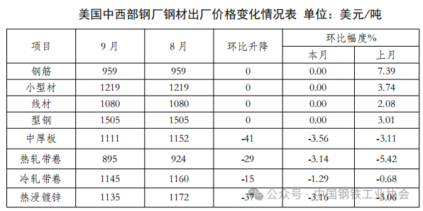 2025年9月份,CRU北美鋼材價(jià)格指數(shù)為232.7點(diǎn),環(huán)比下降4.4點(diǎn),降幅為1.9%;美國制造業(yè)PMI為49.1%,環(huán)比上升0.4個(gè)百分點(diǎn)。本月美國中西部鋼廠鋼材品種走勢(shì)分化,鋼筋、小型材、線材、型鋼價(jià)格較上月持平,其余品種價(jià)格有所下降,中厚板降幅較大,為3.56%,冷軋帶卷降幅較小,為1.29%。(見下表)