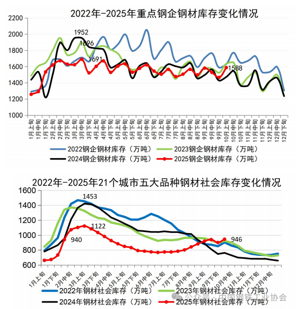 企業(yè)庫存來看,10月上旬重點(diǎn)鋼企鋼材庫存環(huán)比同比明顯增加。2025年10月上旬,重點(diǎn)統(tǒng)計(jì)鋼鐵企業(yè)鋼材庫存量1588萬噸,環(huán)比上一旬增加121萬噸,增長(zhǎng)8.2%;比年初增加351萬噸,增長(zhǎng)28.4%;比上月同旬增加6萬噸,增長(zhǎng)0.6%;比去年同旬增加115萬噸,增長(zhǎng)7.8%。