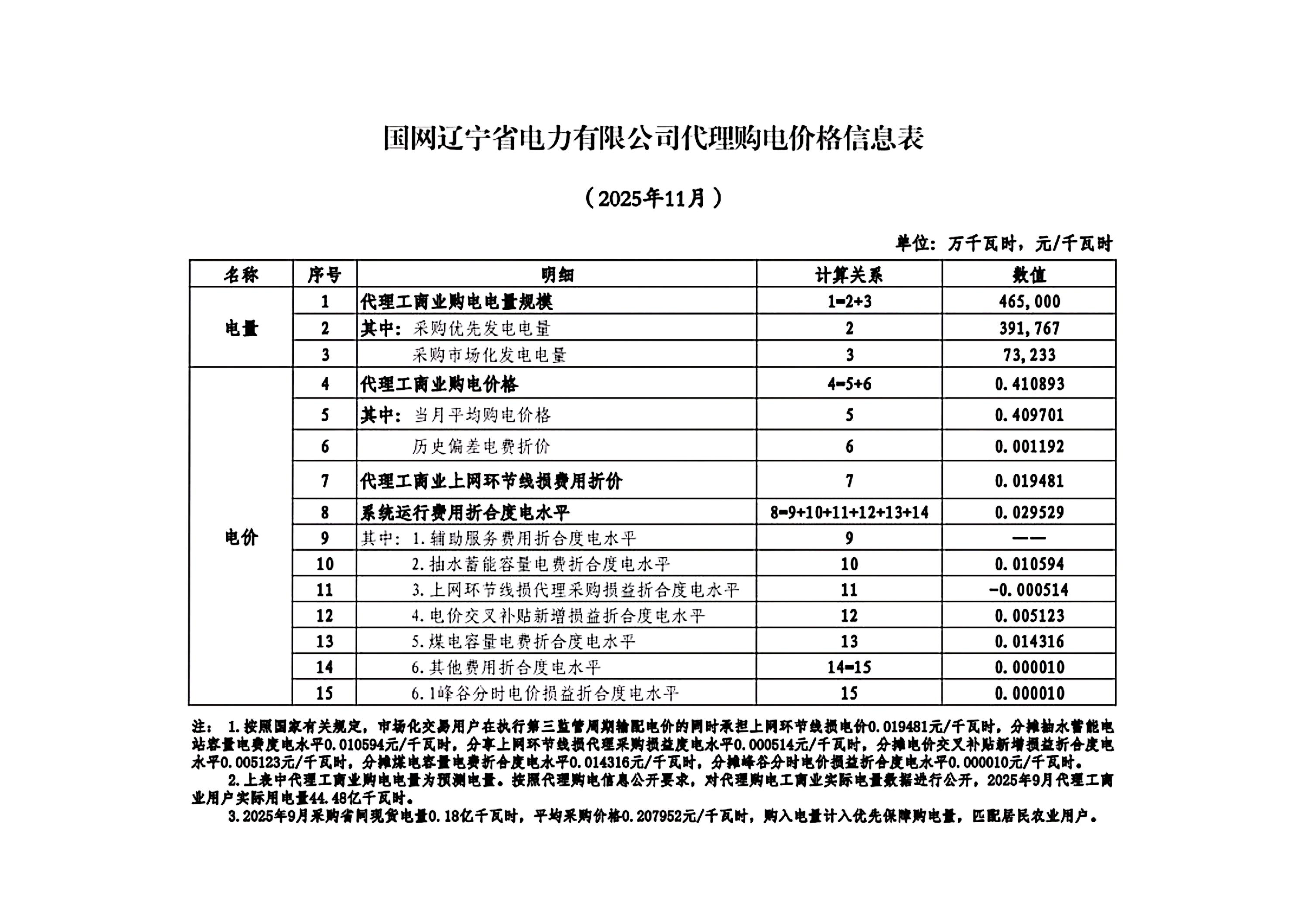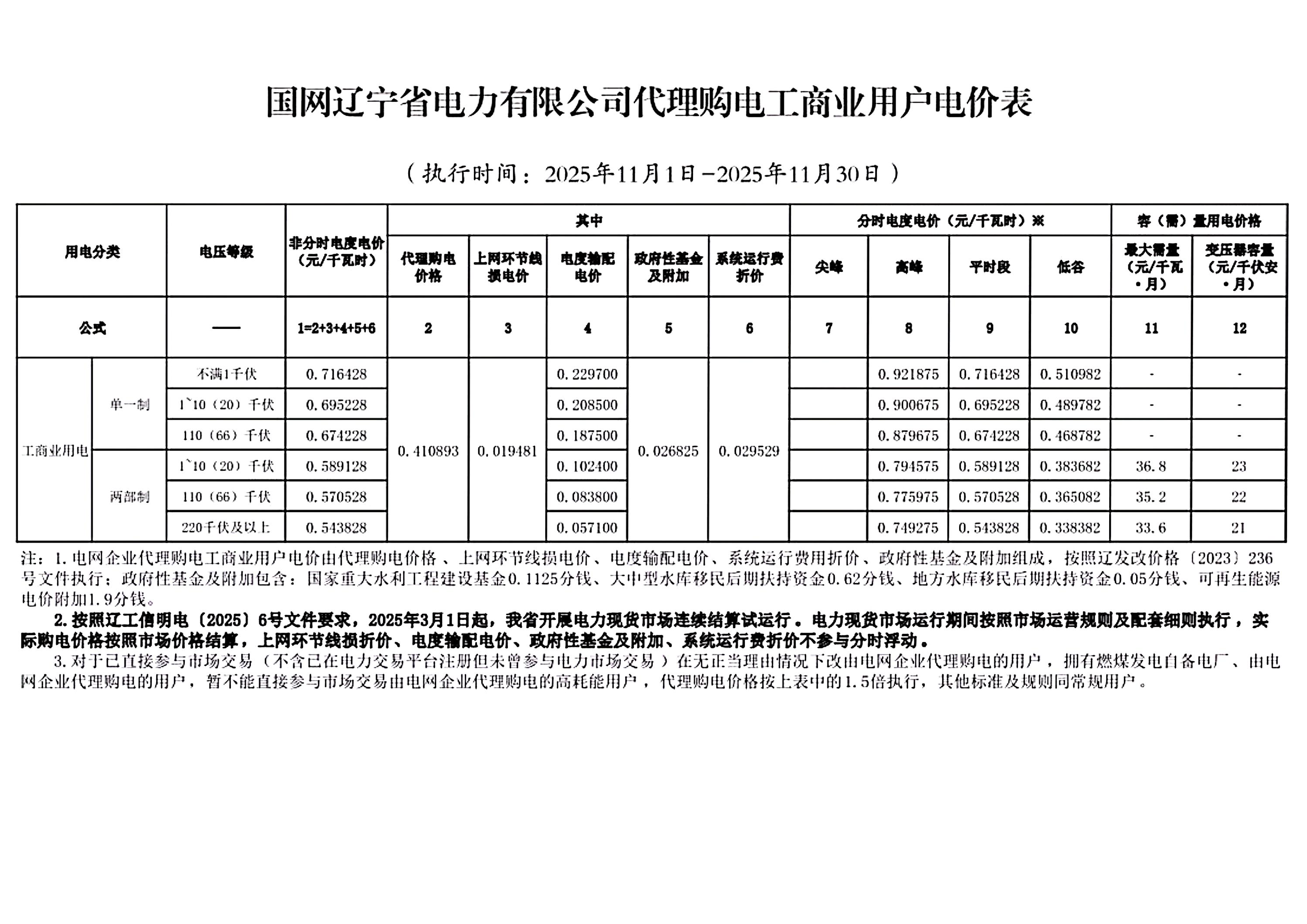 國(guó)網(wǎng)遼寧省電力有限公司代理購(gòu)電工商業(yè)用戶電價(jià)表(2025年11月)