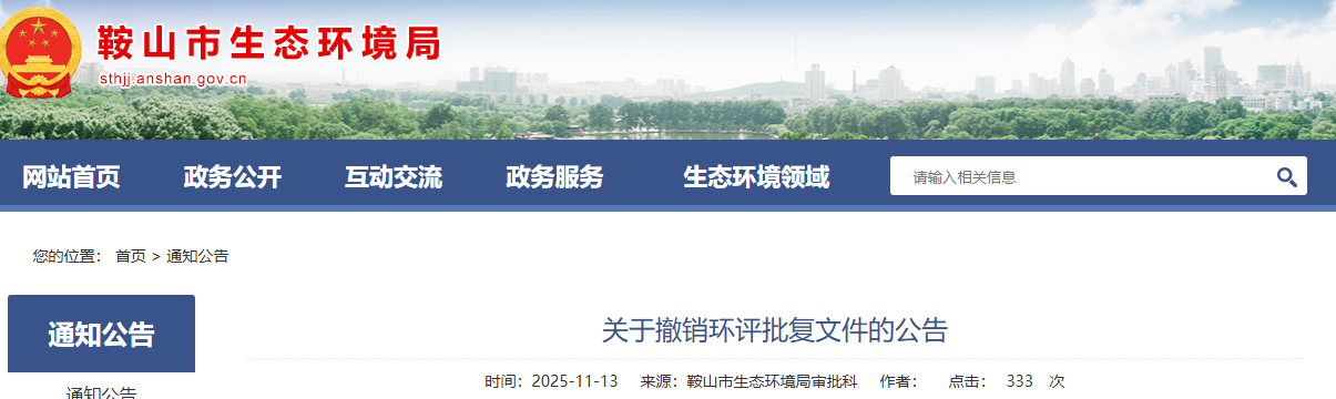 現(xiàn)建設(shè)單位申請(qǐng)撤銷該環(huán)評(píng)批復(fù),依據(jù)《中華人民共和國行政許可法》第六十九條規(guī)定,經(jīng)研究,我局依法決定撤銷《海城市軒鎂耐火材料有限公司改擴(kuò)建項(xiàng)目環(huán)境影響報(bào)告表的批復(fù)》(鞍行審批復(fù)環(huán)〔2023〕14號(hào)),現(xiàn)予以公告。