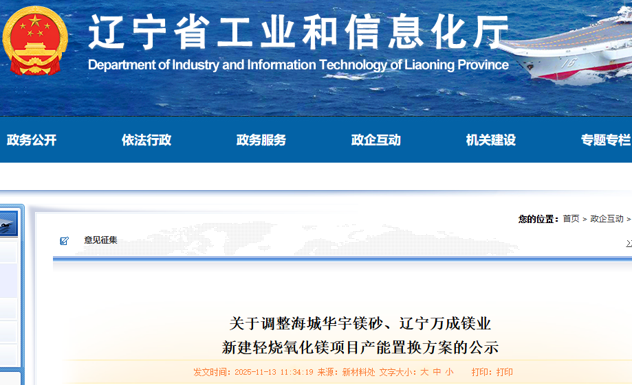 遼寧省工信廳2025年6月19日《關于海城鎂礦集團有限公司等企業(yè)新建輕燒氧化鎂項目產能置換方案的通告》中海城華宇鎂砂有限公司一期新建年產10萬噸輕燒氧化鎂懸浮窯建設項目產能置換方案、海城華宇鎂砂有限公司二期新建年產10萬噸輕燒氧化鎂懸浮窯建設項目產能置換方案、遼寧萬成鎂業(yè)集團有限公司年產20萬噸新建輕燒氧化鎂回轉窯項目產能置換方案擬撤銷。