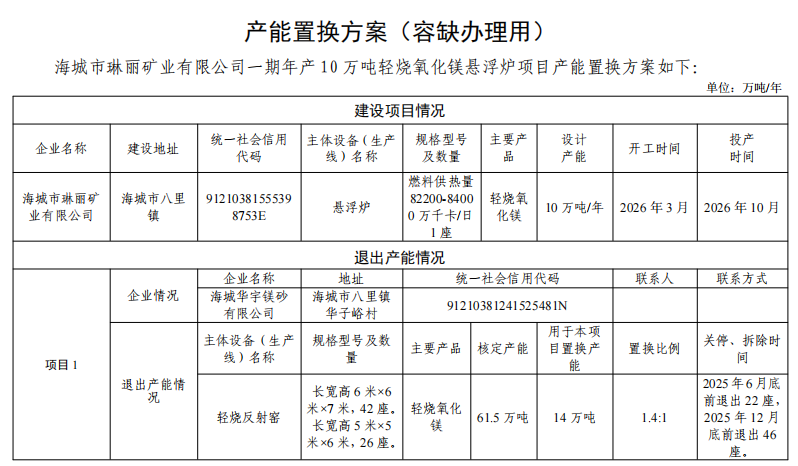1.海城市琳麗礦業(yè)有限公司一期年產10萬噸輕燒氧化鎂懸浮爐項目產能置換方案