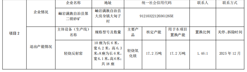 2.海城市琳麗礦業(yè)有限公司二期年產10萬噸輕燒氧化鎂懸浮爐項目產能置換方案