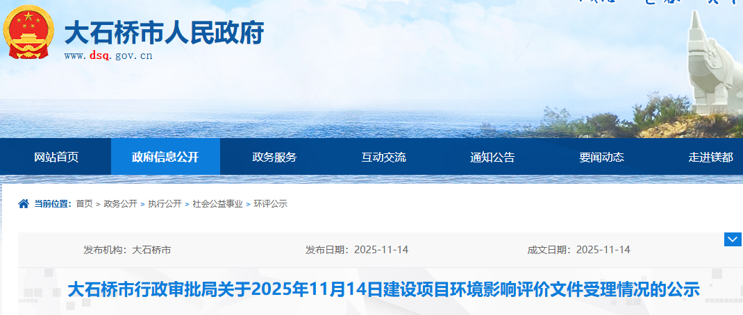 根據(jù)建設(shè)項(xiàng)目環(huán)境影響評(píng)價(jià)審批程序的有關(guān)規(guī)定,2025年11月14日我局受理1個(gè)建設(shè)項(xiàng)目環(huán)境影響評(píng)價(jià)文件。現(xiàn)將受理情況予以公示,公示期為2025年11月14日-2025年11月18日(3個(gè)工作日)。