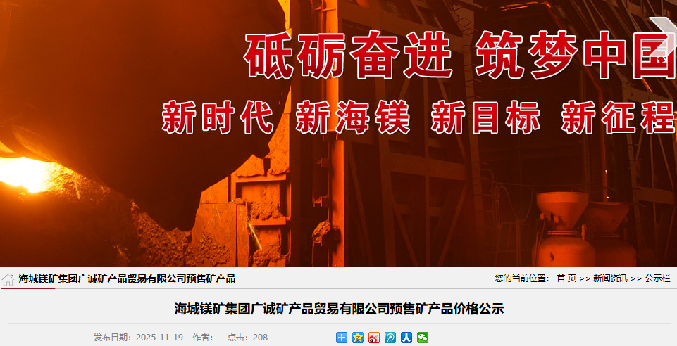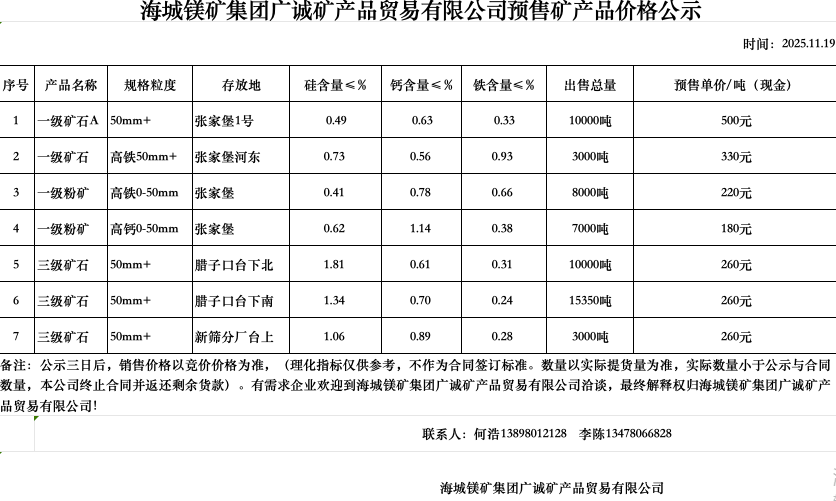海城鎂礦集團(tuán)廣誠(chéng)礦產(chǎn)品貿(mào)易有限公司預(yù)售礦產(chǎn)品價(jià)格公示