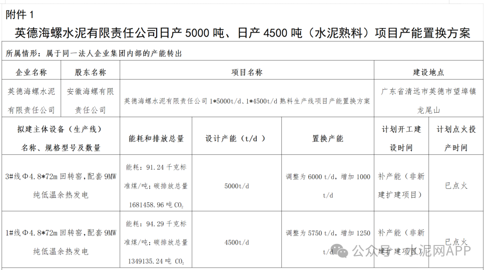 11月14日,廣東省工信廳發(fā)布“關(guān)于英德海螺水泥有限責(zé)任公司日產(chǎn)5000噸、日產(chǎn)4500噸(水泥熟料)項(xiàng)目產(chǎn)能置換方案的公示”。
