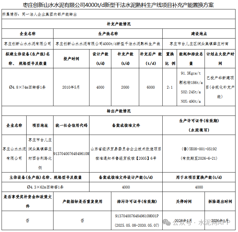 置換方案顯示,棗莊創(chuàng)新山水水泥4000t/d熟料生產(chǎn)線(xiàn)補(bǔ)充產(chǎn)能2000t/d,補(bǔ)充后產(chǎn)能6000t/d,退出產(chǎn)能來(lái)自棗莊山水水泥4000t/d熟料生產(chǎn)線(xiàn),置換比例2:1。