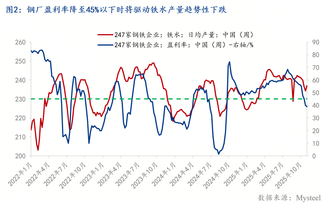 當(dāng)前鋼市運(yùn)行的核心邏輯是負(fù)反饋,根源在于需求淡季下的鋼材去庫壓力,而歷史上鋼市負(fù)反饋行情多發(fā)生在“金三銀四”及“金九銀十”旺季,最根本原因是旺季鋼材去庫不及預(yù)期。歷史規(guī)律顯示,鋼材去庫拐點(diǎn)通常比鋼廠盈利率拐點(diǎn)提前15-30天,核心邏輯是:旺季初期去庫乏力矛盾未顯現(xiàn),鋼廠盈利仍上升;后期去庫乏力引發(fā)市場對供應(yīng)過剩的判斷,進(jìn)而通過打壓利潤倒逼鋼廠減產(chǎn)。鋼市負(fù)反饋觸發(fā)的根本條件是旺季鋼材庫存去化不及預(yù)期,而利潤水平則是決定鋼廠是否減產(chǎn)的直接原因——庫存去化不及預(yù)期會導(dǎo)致鋼廠盈利率下降,降至一定水平后鋼廠將通過減產(chǎn)緩解供應(yīng)壓力。2022年以來的歷史經(jīng)驗(yàn)顯示,當(dāng)鋼市供過于求、庫存去化乏力時(shí),打壓鋼廠利潤倒逼減產(chǎn)是唯一緩解矛盾的途徑,且存在明確規(guī)律:鋼廠盈利率拐點(diǎn)領(lǐng)先鐵水拐點(diǎn)約兩個月,盈利率降至45%以下鐵水產(chǎn)量才會趨勢下跌,降至10%-25%中樞水平鐵水產(chǎn)量才見底。鋼市負(fù)反饋的核心目標(biāo)是通過倒逼鋼廠減產(chǎn),緩解供應(yīng)過剩導(dǎo)致的鋼材庫存去化乏力問題,評估減產(chǎn)程度的關(guān)鍵指標(biāo)為Mysteel247家日均鐵水產(chǎn)量(與五大鋼材產(chǎn)量存在趨勢相關(guān)性,且今年以來比值均值約為1.93)。以2022-2023年國慶節(jié)后(與今年同期庫存高點(diǎn)相當(dāng)、去庫節(jié)奏雷同)的去庫表現(xiàn)為參考,從去庫速率(今年21萬噸/周vs兩年均值46萬噸/周)和去庫降幅(今年8%vs兩年均值17%)兩個維度進(jìn)行推算,結(jié)論便是鐵水產(chǎn)量均需從國慶后高點(diǎn)242萬噸/日降至200萬噸/日左右,才能實(shí)現(xiàn)去庫節(jié)奏趨同;然而當(dāng)前鐵水產(chǎn)量在236萬噸/日,理論上仍有36萬噸減產(chǎn)空間。理論推算的鐵水平衡低點(diǎn)200萬噸/日,低于過去四年負(fù)反饋行情下的鐵水最低值213萬噸/日,凸顯今年國慶后鋼材庫存去化動能極度羸弱。但Mysteel排產(chǎn)調(diào)研顯示,未來鐵水低點(diǎn)或在228-230萬噸/日,與理論值存在差距,核心原因在于鋼廠盈利水平。因此,后續(xù)需重點(diǎn)跟蹤鋼廠盈利變化,這是影響減產(chǎn)落地程度及庫存去化進(jìn)程的關(guān)鍵因素。
