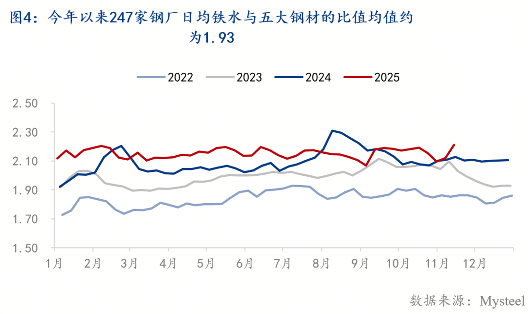鋼市負(fù)反饋的最終目的在于倒逼鋼廠減產(chǎn),以此緩解供應(yīng)邊際過剩所帶來的鋼材庫存去化乏力的壓力,那么減產(chǎn)需減到何種程度,才能緩解這種壓力呢?產(chǎn)量端,我們通過錨定Mysteel247家日均鐵水產(chǎn)量,以此作為評估減產(chǎn)程度的最終指標(biāo)。首先,由于五大鋼材產(chǎn)量與247家日均鐵水產(chǎn)量之間存在一定的換算關(guān)系:1、兩個指標(biāo)存在一定的趨勢相關(guān)性(如下圖3);2、今年以來兩者之間的比值均值約為1.93(如下圖4)。因此,根據(jù)上述兩個指標(biāo)之間的關(guān)系,便可推導(dǎo)出247家日均鐵水產(chǎn)量最終需減至何種水平,來達(dá)到鋼材庫存去化的平衡狀態(tài)。
