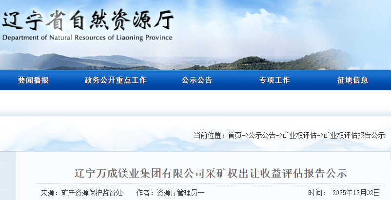 遼寧萬(wàn)成鎂業(yè)集團(tuán)有限公司采礦權(quán)出讓收益評(píng)估報(bào)告通過(guò)遼寧省自然資源廳門戶網(wǎng)站向社會(huì)公示,公示10個(gè)工作日。如有異議,請(qǐng)于公示之日起10個(gè)工作日內(nèi)以電話方式先向省自然資源廳礦產(chǎn)資源保護(hù)監(jiān)督處提出簡(jiǎn)要意見(jiàn),隨后及時(shí)將書面意見(jiàn)反饋到省自然資源廳礦產(chǎn)資源保護(hù)監(jiān)督處。