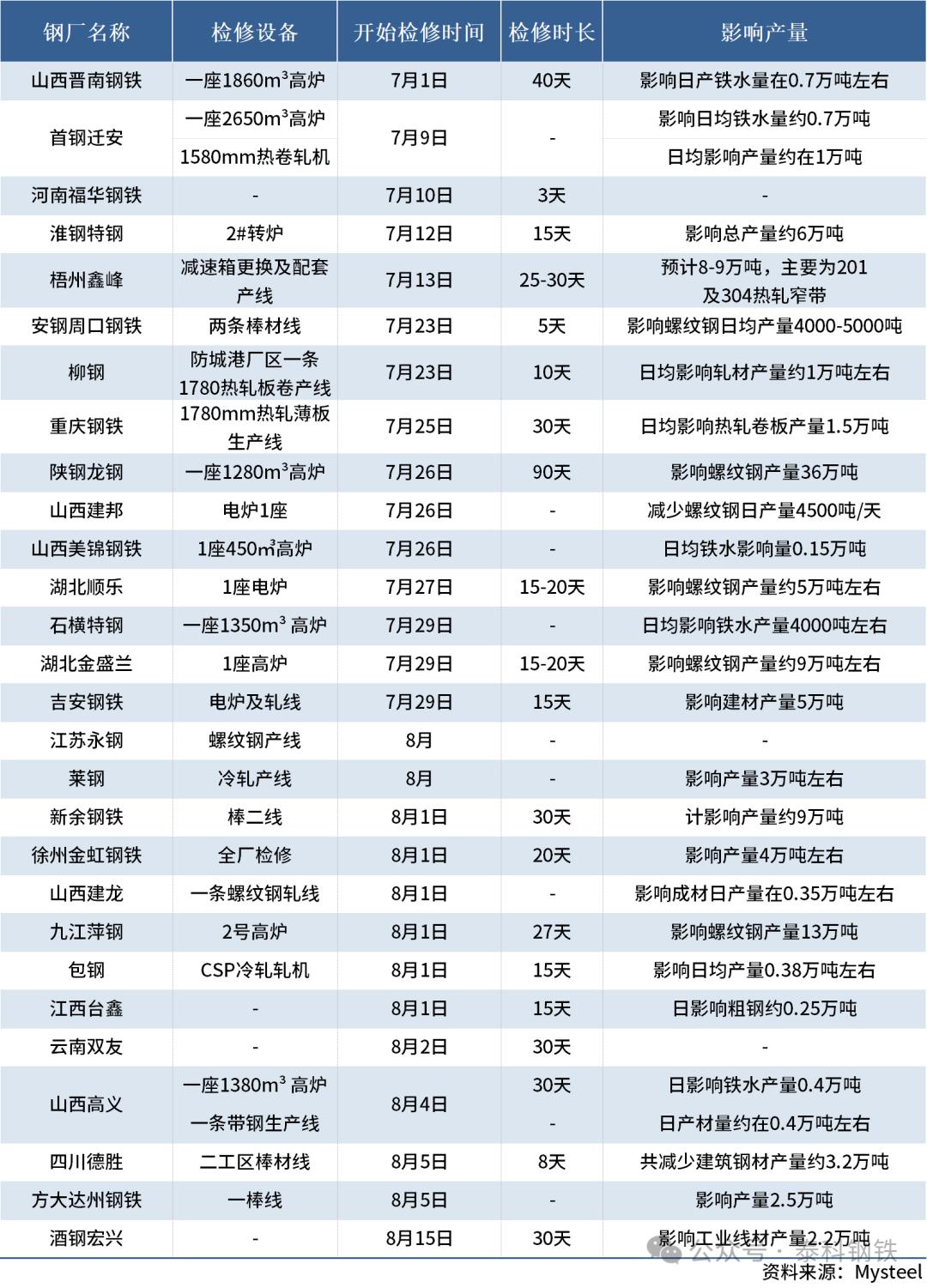 據(jù)不完全統(tǒng)計,截至8月1日,國內(nèi)28家鋼廠發(fā)布檢修信息。其中,包鋼計劃于8月1日對CSP冷軋軋機進行停產(chǎn)檢修,預(yù)計檢修15天,影響日均產(chǎn)量0.38萬噸左右。