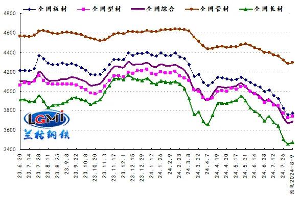 2024年第31周(2024.7.29-8.2)蘭格鋼鐵全國絕對價格指數(shù)為3670元,較上周下降1.5%,較去年同期下降12.4%;其中,蘭格鋼鐵長材絕對價格指數(shù)為3458元,較上周下降1.3%,較去年同期下降12.2%;蘭格鋼鐵型材絕對價格指數(shù)為3723元,較上周下降1.3%,較去年同期下降10.5%;蘭格鋼鐵板材絕對價格指數(shù)為3754元,較上周下降1.7%,較去年同期下降13.8%;蘭格鋼鐵管材絕對價格指數(shù)為4281元,較上周下降0.8%,較去年同期下降7.5%。