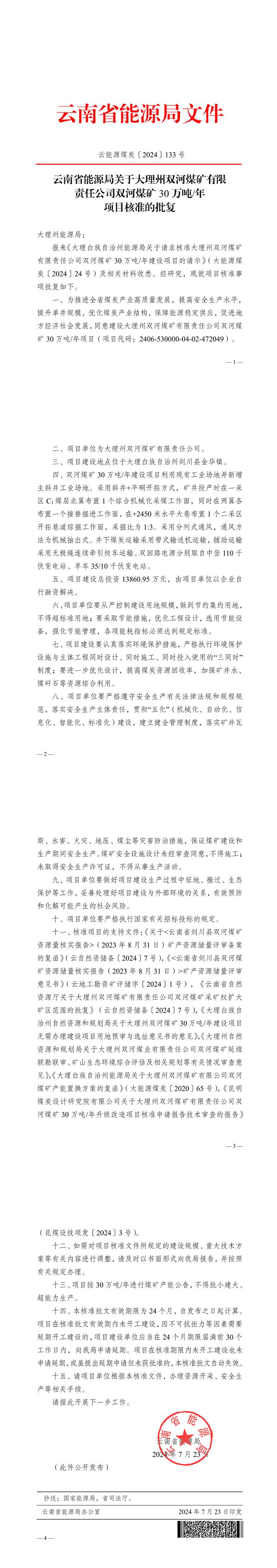 云南大理雙河煤礦30萬(wàn)噸/年項(xiàng)目核準(zhǔn)