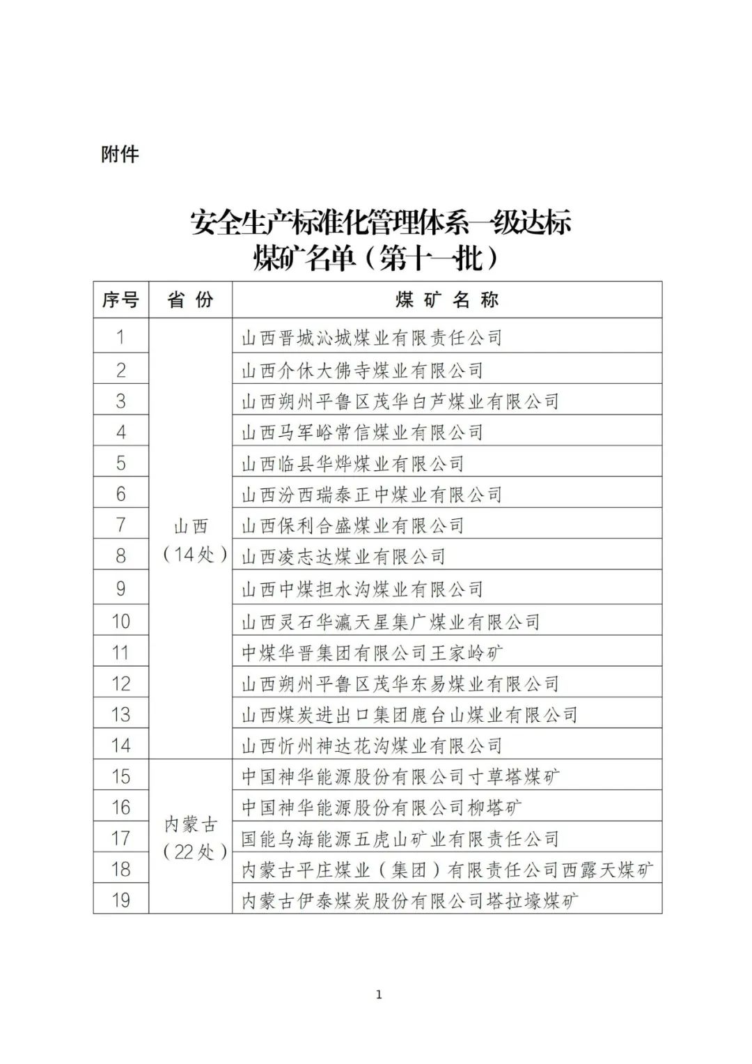 安全生產(chǎn)標(biāo)準(zhǔn)化管理體系一級(jí)達(dá)標(biāo)煤礦名單(第十一批)的通知