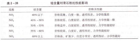高品質(zhì)超微細(xì)滑石粉成片狀結(jié)構(gòu),用于塑料制品時(shí),作為增強(qiáng)、改性功能填料不但能節(jié)省樹脂的使用量,還能顯著提高產(chǎn)品的剛度、沖擊強(qiáng)度、彎曲模量和熱穩(wěn)定性。滑石粉可均勻的成層疊狀分散在樹脂中,與樹脂有較好的相容性和力學(xué)性能的互補(bǔ)性。如同水泥制品中嵌入的金屬結(jié)構(gòu)網(wǎng),能夠在保持塑料的自身優(yōu)點(diǎn)時(shí),形成力學(xué)性能優(yōu)異的增強(qiáng)支撐形態(tài),可提高塑料制品的物理性能,滑石粉的光散射作用還具有明顯的保溫、阻隔性能,在降低生產(chǎn)成本的同時(shí),可明顯改善塑料制品的力學(xué)性能和物理性能。決定工業(yè)滑石粉質(zhì)量的主要指標(biāo)要看滑石粉的純度、白度和細(xì)度。評價(jià)一種滑石產(chǎn)品的優(yōu)劣,僅以一個(gè)指標(biāo)判斷質(zhì)量是片面的和不確切的。滑石的純度越高,其增強(qiáng)的效果越好?;械钠渌V物雜質(zhì),金屬類礦物(特別是鐵)對塑料的耐老化性有十分明顯的影響?;壑械墓?SiO2)含量是衡量滑石粉品位的重要指標(biāo),滑石粉中硅含量越高,滑石的純度越高,應(yīng)用效果也好,價(jià)格也越高。我們要根據(jù)不同的塑料制品性能要求來選擇滑石粉,如在農(nóng)用薄膜中使用高硅滑石粉,不但薄膜的透光率好、薄膜的拉伸強(qiáng)度、斷裂強(qiáng)度、抗穿刺性等指標(biāo)都有提高。而在注塑、板材、棒材中使用的滑石粉硅含量要求不高,硅成分較低的產(chǎn)品不但價(jià)格較低,同時(shí)還可改善塑料制品的硬度、沖擊強(qiáng)變等?;壑械腟iO2含量對滑石粉的性能影響可參見表。
