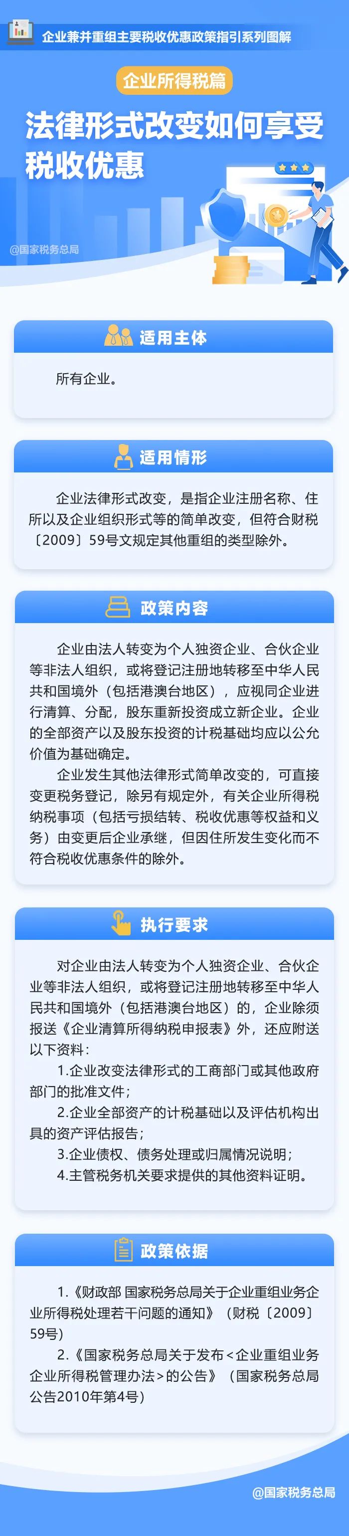 為引導(dǎo)企業(yè)正確適用兼并重組稅收政策,財(cái)政部、稅務(wù)總局等部門編寫了《企業(yè)兼并重組主要稅收優(yōu)惠政策指引》,對(duì)現(xiàn)行有效的支持企業(yè)兼并重組主要稅收優(yōu)惠政策和稅收征管文件進(jìn)行了梳理,并按照企業(yè)兼并重組的類型,分門別類明確了適用主體、適用情形、政策內(nèi)容、執(zhí)行要求及政策依據(jù)等內(nèi)容,為納稅人提供簡(jiǎn)明易行、獲得感強(qiáng)的操作指南。今天學(xué)習(xí):企業(yè)兼并重組企業(yè)所得稅優(yōu)惠政策——法律形式改變?nèi)绾蜗硎芏愂諆?yōu)惠?