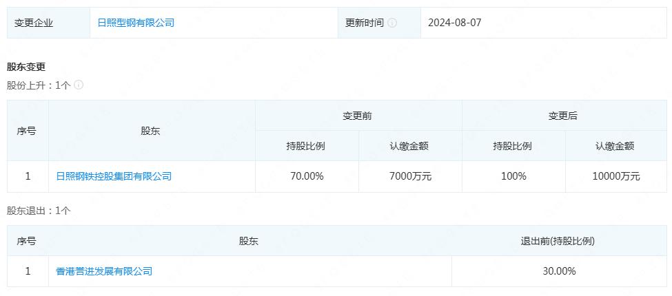 8月7日,據(jù)企查查顯示,日照鋼鐵控股集團(tuán)有限公司在日照型鋼有限公司的持股比例上升,從70%增加到100%,日照型鋼有限公司成為日照鋼鐵控股集團(tuán)有限公司100%控股子公司,具體情況如下: