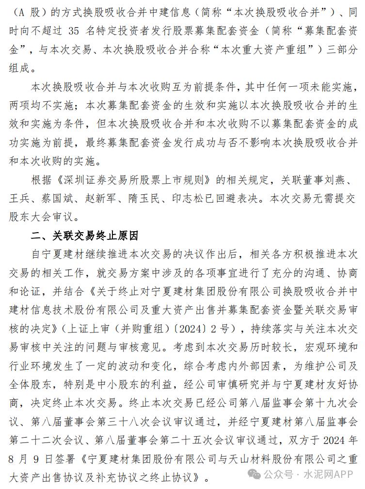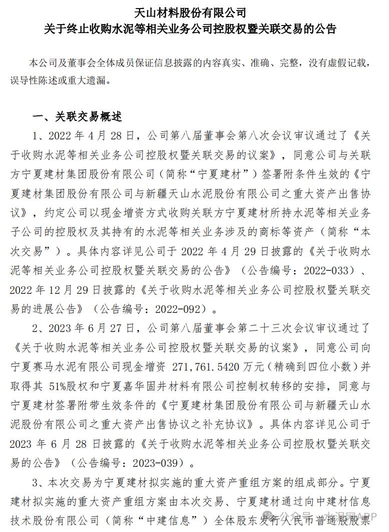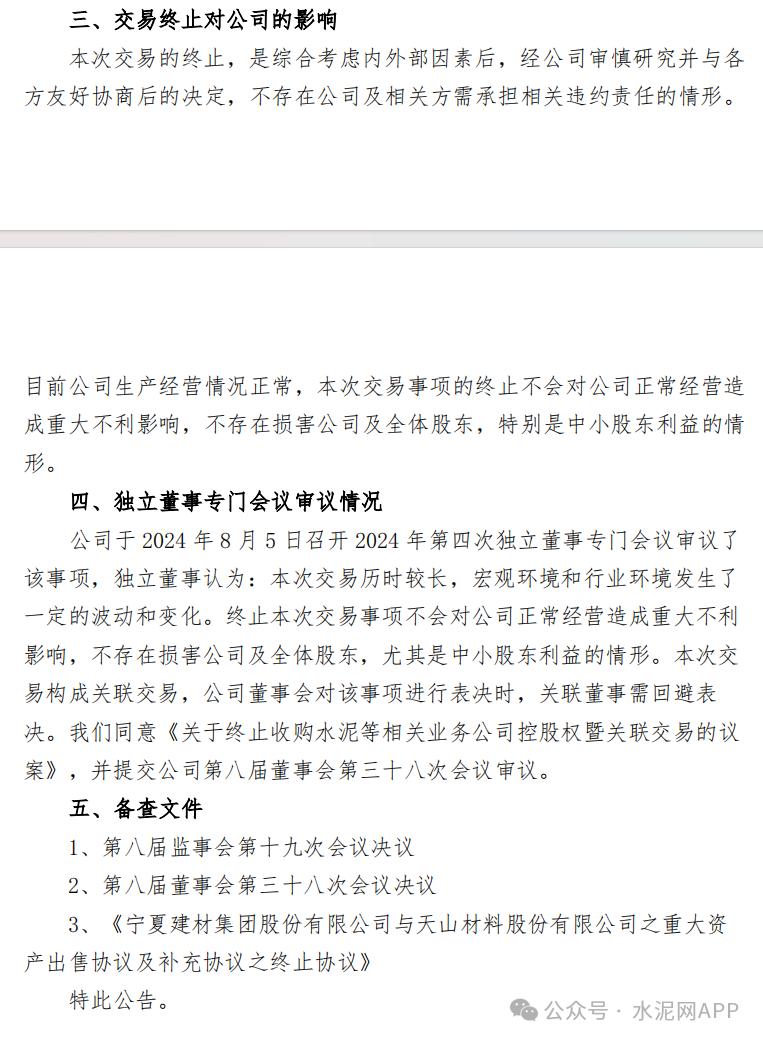 天山股份8月9日晚間公告,因交易歷時(shí)較長(zhǎng),宏觀環(huán)境和行業(yè)環(huán)境發(fā)生了一定的波動(dòng)和變化,公司決定終止此前計(jì)劃收購(gòu)關(guān)聯(lián)方寧夏建材所持水泥等相關(guān)業(yè)務(wù)子公司的控股權(quán)及其持有的水泥等相關(guān)業(yè)務(wù)涉及的商標(biāo)等資產(chǎn)的交易。天山股份同時(shí)公告,公司實(shí)控人中國(guó)建材集團(tuán)、控股股東中國(guó)建材股份正在積極研究論證關(guān)于基礎(chǔ)建材板塊相關(guān)企業(yè)的其他整合方案,并計(jì)劃在條件成熟后推進(jìn)。