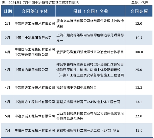 據(jù)中國(guó)中冶消息,2024年1-7月新簽合同額人民幣7504.4 億元,較上年同期降低6.4%,其中10億元以上的重大鋼鐵相關(guān)工程承包合同8個(gè),合同金額216.1億元,具體項(xiàng)目明細(xì)如下: