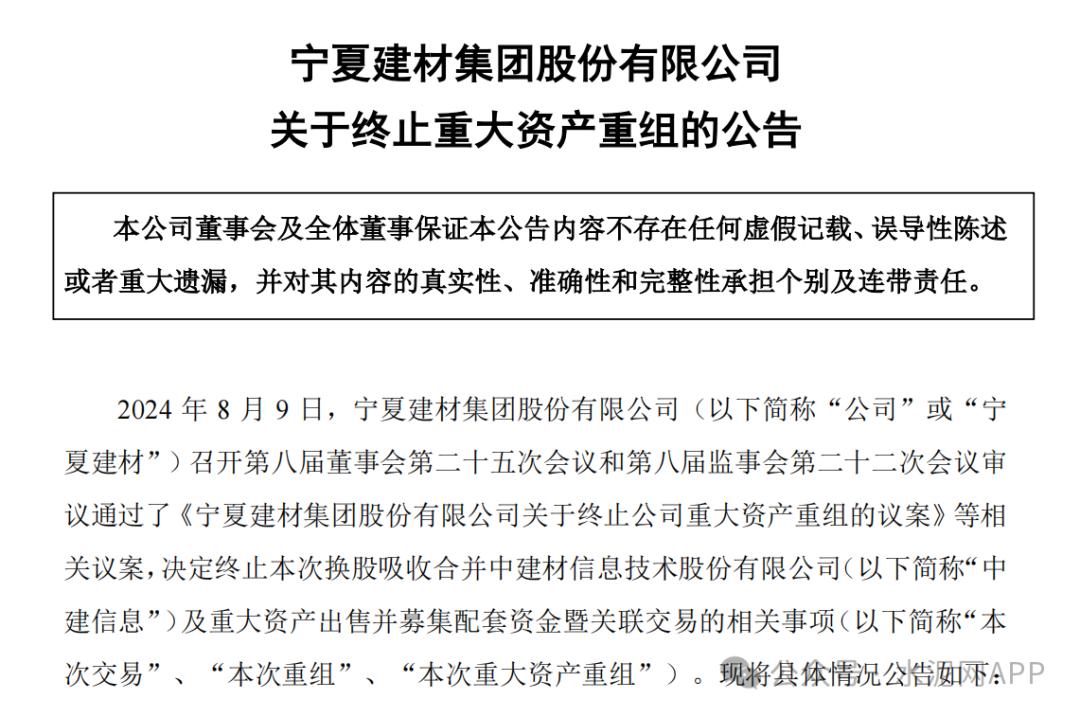 實(shí)為“老問題”未解決“當(dāng)時(shí)進(jìn)行這個(gè)重組交易主要就是為了解決我們和天山股份之間存在的同業(yè)競爭問題。目前,交易終止主要原因還是我們吸收合并的中建信息涉及的應(yīng)收賬款問題,經(jīng)過這么長時(shí)間,還是沒能梳理清晰?!?月13日下午,寧夏建材方面對(duì)記者表示。今年1月底,上交所便發(fā)布了關(guān)于終止寧夏建材吸收合并中建信息及重大資產(chǎn)出售并募集配套資金的審核決定。